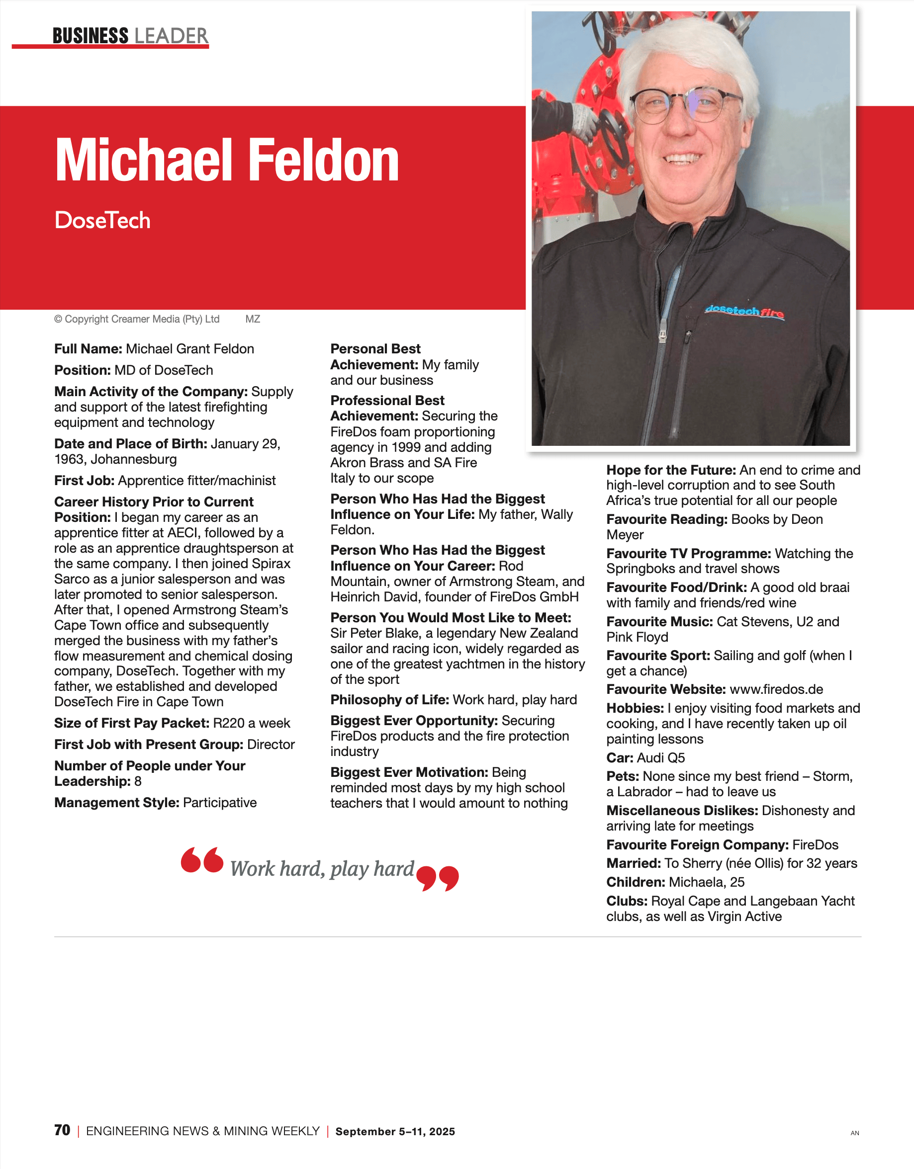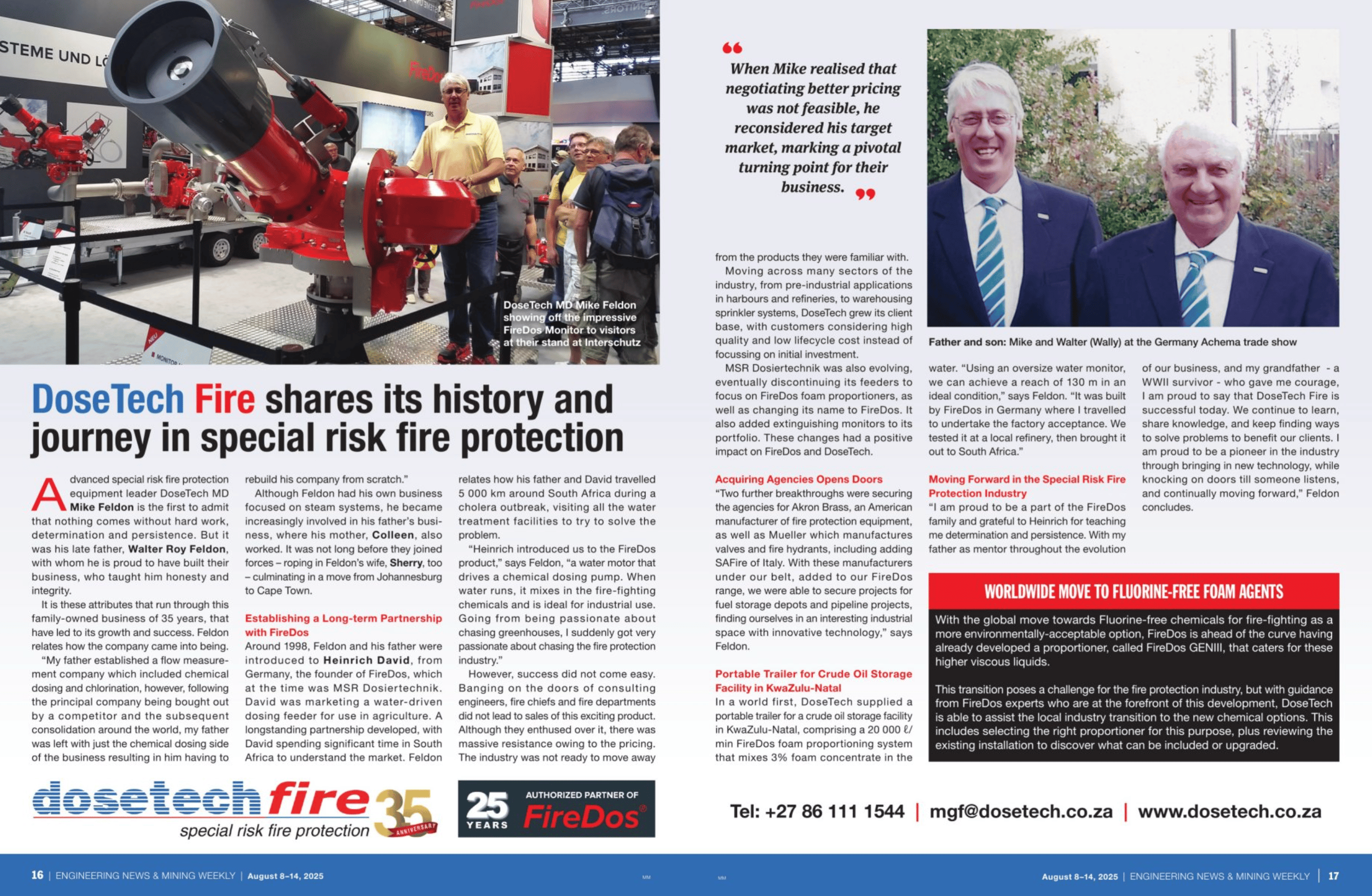 At DoseTech [Pty] Ltd, trading as DoseTech Fire, we are dedicated to providing  innovative technology and solutions in Special Risk Fire Protection, Foam Proportioning Systems (FireDos™) and specialised Fire Fighting Hardware for high-risk environments. With over two decades of expertise, we deliver only the most reliable, top-tier equipment sourced from both Europe and USA.